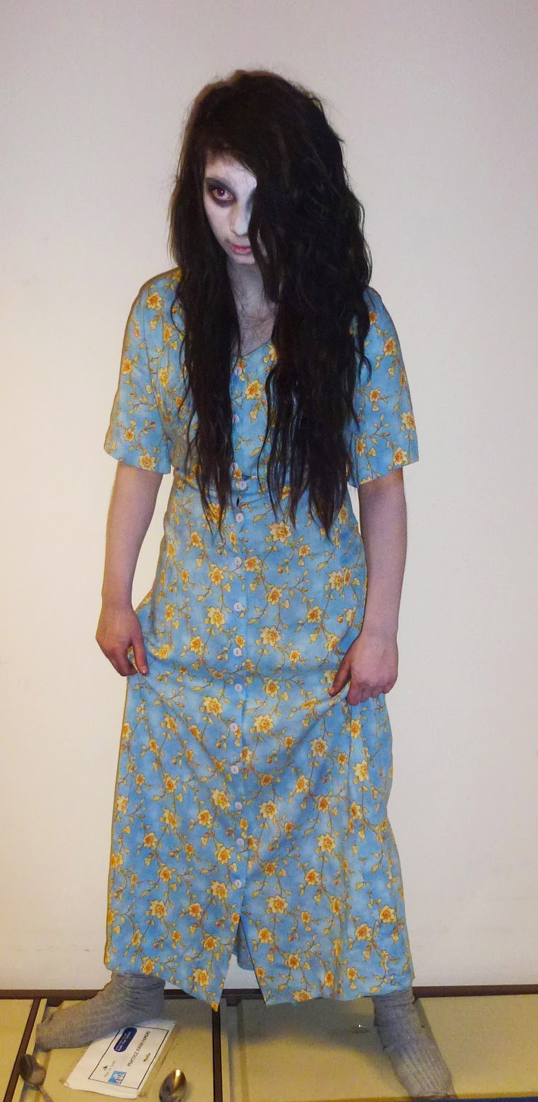We then also found a light blue dress with yellow flowers on which was a size 20. However once it was on, it seemed to fit better than we expected and used a few safety pins to pin it back. We really liked this outfit simply because it was very innocent. Yellows and baby blues are often associated with children and summer, so this is a slight condraction with the character that we wanted her to play. It's also very long, and isn't something that would be considered 'fashion' nowadays which is what we wanted because of the date she went missing. There was also a contrast between the dark hair and make up and the bright dress which is what we wanted to create an effect when the audience viewed our film. We decided this would be our FINAL DRESS.